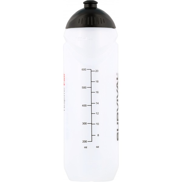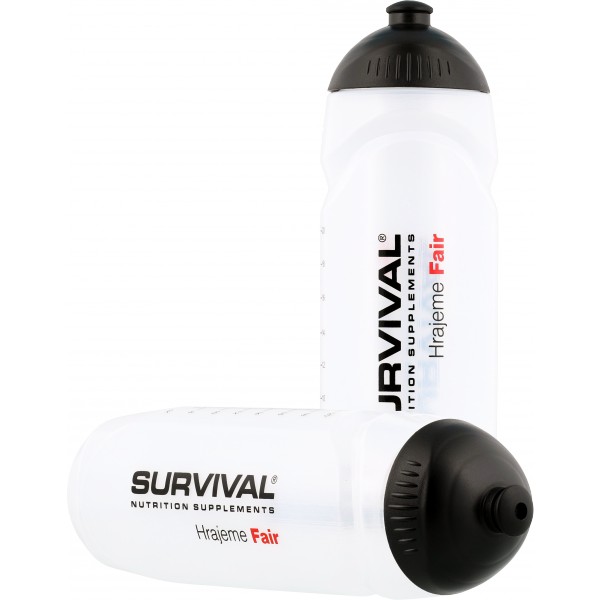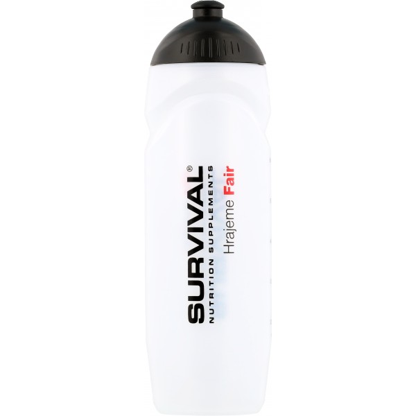 750 ml. Po straně má rysky objemu pro snadné zjištění množství nápoje uvnitř. Černé šroubovací víčko s černým posuvným náústkem. Bez hubice. Láhev je bílé/transparentní barvy, na sobě má logo Survival a nápisy Hrajeme Fair v černo-červeném provedení. Stupnice je uvedena jak v jednotkách ml, tak oz.