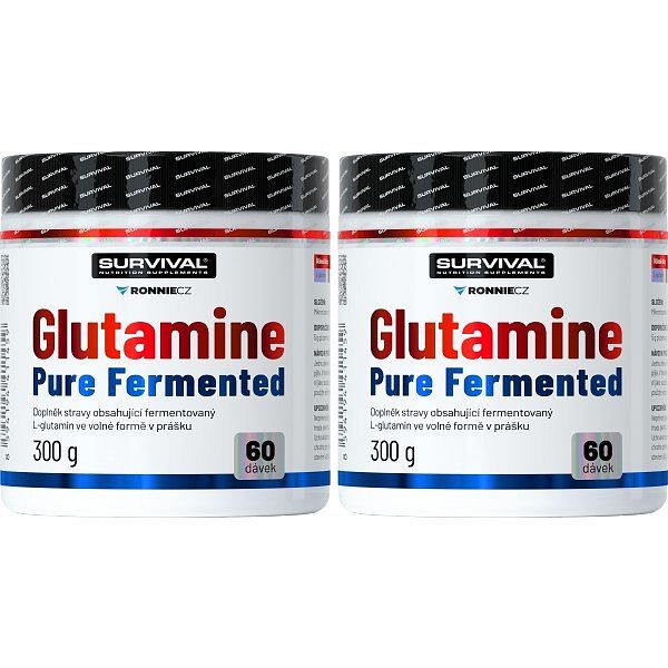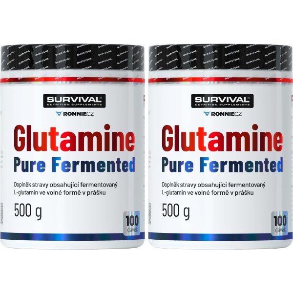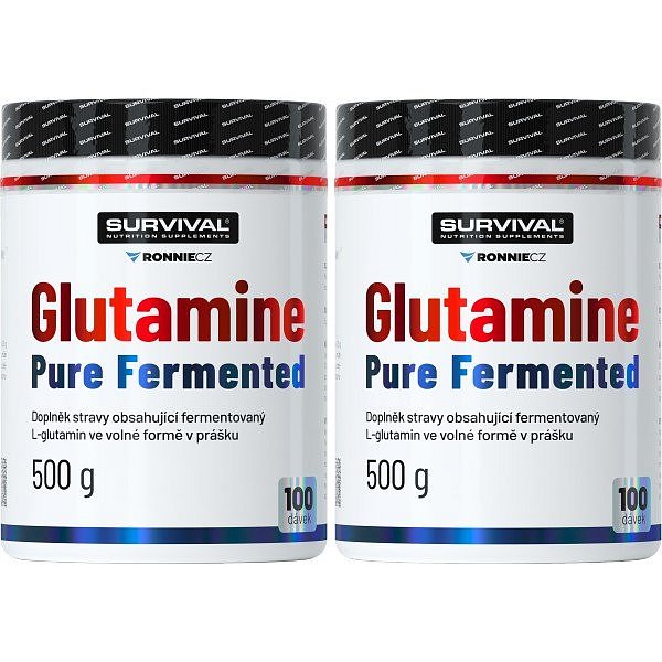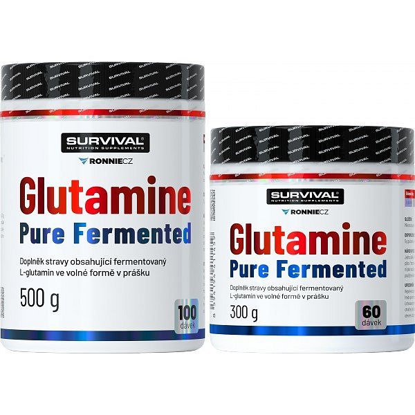 Glutamine Pure Fermented značky Survival nabízí 500gramové a/nebo 300gramové, cenově velmi výhodné balení volné formy této semiesenciální aminokyseliny, kterou je zvlášť vhodné používat bezprostředně po tréninku (bez problémů v kombinaci s jinými doplňky sportovní výživy) a také večer před spaním.
