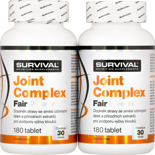 Joint Complex Fair Power představuje unikátní směs 11 látek, ověřených výzkumy, pro výraznou podporu kloubního aparátu, která – bez jakékoliv nadsázky či reklamního přehánění – nemá na současném evropském trhu obdoby. Receptura produktu Joint Complex Fair Power byla postavena na základě studií věnujících se problematice netraumatického poškození kloubů a pojivových tkání. Joint Complex Fair Power ocení tedy nejen zdraví sportovci v rámci prevence, ale také jedinci s již přítomnými zdravotními obtížemi. Joint Complex Fair Power představuje ideální suplement pro maximální podporu výživy kloubního aparátu v té nejvyšší kvalitě značky Survival. Porovnejte složení svého kloubního preparátu s Joint Complex Fair Power a sami se přesvědčte o jeho kvalitách!