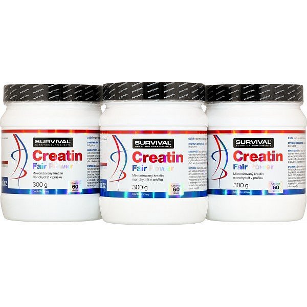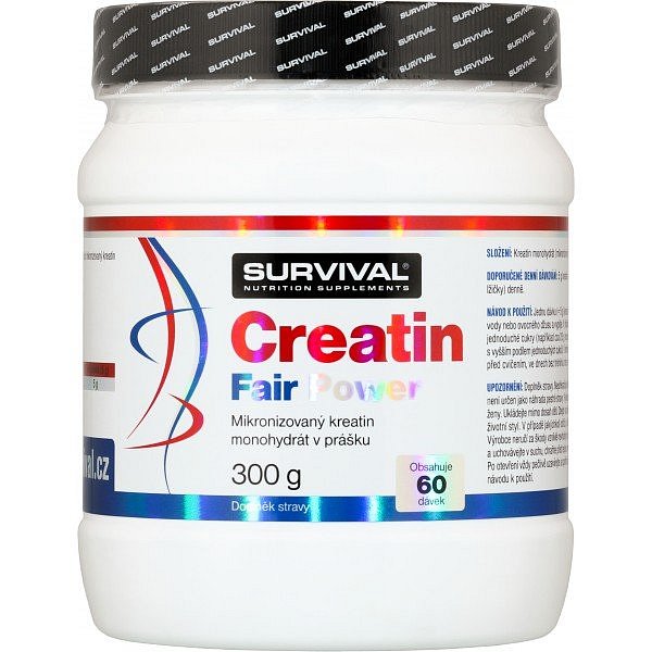 Creatin Fair Power (kreatin monohydrát) patří k nejosvědčenějším doplňkům sportovní výživy. Kreatin zvyšuje fyzickou výkonnost při po sobě jdoucích krátkodobých intervalech vysoce intenzivního fyzického výkonu – příznivého účinku se dosáhne při přívodu 3 g kreatinu denně. Creatin Fair Power společnosti Survival je vysoce čistou mikronizovanou formou kreatin monohydrátu bez obsahu jakýchkoliv jiných přísad. Mikronizovaná forma umožní snadnou přípravu, rychlou rozpustnost a maximální využitelnost v lidském organismu. Balení Creatin Fair Power společnosti Survival vystačí při ideálním doporučeném dávkování přesně na jeden 30denní cyklus užívání. Kvalitu Creatin Fair Power garantuje majitel trenérské školy Ronnie.cz a vyhledávaný osobní trenér vrcholových sportovců Pavel Provázek.