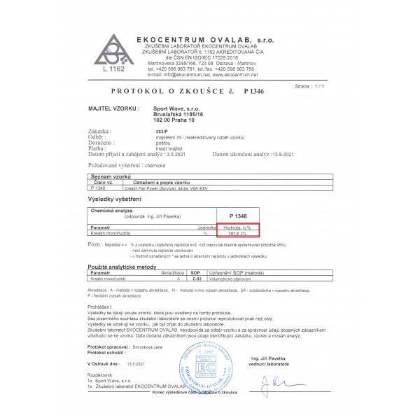Creatin Fair Power vyrobený ve společnosti Survival je nejčistší formou mikronizovaného kreatinu. Samozřejmě, že bychom Vám mohli na obale napsat údaj 100 % jako ostatní výrobci, ale pak bychom se styděli za slovo "fair" v názvu našeho produktu. Nenajdete totiž na trhu kreatin monohydrát, který by obsahoval skutečných 100 % kreatinu. Nejlepší laboratorní rozbory ukáží maximálně hodnotu 99,5 %. A to je i výsledek, který má náš kreatin. Ten pro Vás pravidelně testujeme v nezávislých laboratořích, výsledky aktuálních rozborů najdete vždy na našich stránkách. Za kvalitu našeho kreatinu dám s klidem ruku do ohně. Až ho vyzkoušíte, věřím, že byste ji tam dali i Vy se mnou.