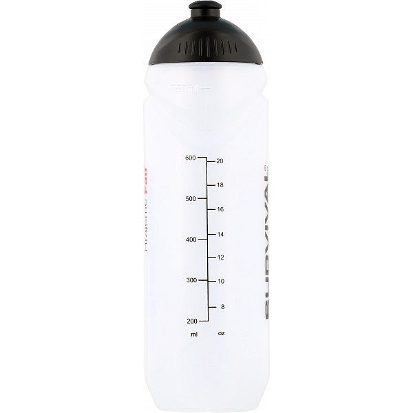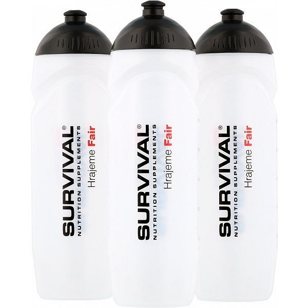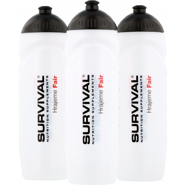 750 ml. Po straně má rysky objemu pro snadné zjištění množství nápoje uvnitř. Černé šroubovací víčko s černým posuvným náústkem. Bez hubice. Láhev je bílé/transparentní barvy, na sobě má logo Survival a nápisy Hrajeme Fair v černo-červeném provedení. Stupnice je uvedena jak v jednotkách ml, tak oz.